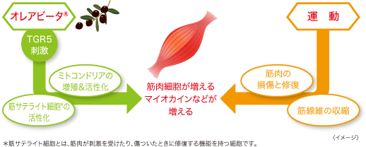 TGR5を刺激してミトコンドリアが増殖・活性化すると筋肉細胞が増えることがわかっています。そこに外側からの筋肉運動を加えることで、さらなる筋肉増加効果が期待できます。その結果、美と健康に関わるさまざまな効果が期待される「マイオカイン」というホルモン様物質も増え、全身にさまざまな良い作用をもたらすことが期待できます。