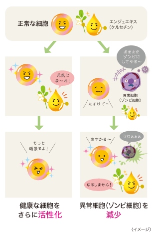 細胞には傷ついても修復する力が備わっていますが、修復不可能になると細胞分裂が停止して自ら死んでいきます(アポトーシス)。しかし、中には死なずに組織にとどまる異常細胞(ゾンビ細胞)があり、カラダの機能を低下させてしまうだけでなく、周りの細胞をもゾンビ細胞へ変化させてしまいます。全身を健康かつ活性化した細胞で満たすには、細胞をエネルギーで満たすのと同時に、このゾンビ細胞をできる限り減らして環境を整えることが重要です。このゾンビ細胞にアプローチするのが、特殊技術によりカラダへの利用率を高めた「エンジュエキス(ケルセチン)」。エンジュエキス(ケルセチン)には健康な細胞を活性化し、ゾンビ細胞を減少する働きが期待されています。