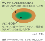 メロンから抽出した抗酸化酵素(メロンSOD)をグリアディン(小麦たんぱく)でコーティングした成分です。生体内で「抗酸化酵素」を増やすことが確認されており、抗酸化素材で有名なCoQ-10、α-リポ酸と比べても高い抗酸化力を持つ「抗酸化酵素」を体内で増加させ、活性酸素を消去する機能を高めると報告されています。