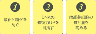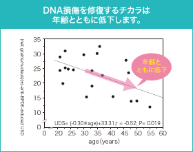 細胞には「核」と呼ばれる中枢部に遺伝情報(カラダの設計図)を持つDNAが収納されています。DNAは一日最大50万回もの酸化的損傷を受けるといわれており、細胞減少の一因となっています。損傷したDNAは修復されれば正常なDNAに戻りますが、年齢とともにこの修復能力は衰えてしまうのです。