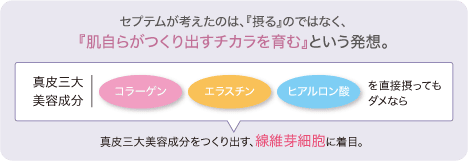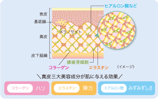 ハリ・弾力・うるおいを支えるのが真皮三大美容成分(コラーゲン、エラスチン、ヒアルロン酸)です。この真皮三大美容成分をつくり出す重要な働きを担っているのが、肌を構成する真皮の中に存在する線維芽細胞です。