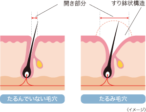 年齢を重ねると、肌を支える力が少しずつ弱くなります。すると表皮が下方向へ引っ張られ、毛穴のまわりがゆるんですり鉢状のように落ち込んでいくことに。その結果、本来は丸いはずの毛穴が、下に伸びしずくのような形へ変化します。それがハリ不足やシワ、たるみ、フェイスラインのゆるみなど、さまざまな老け見えのサインにつながります。だからこそ、肌を内側から支える土台をケアすることが大切なのです。