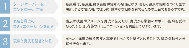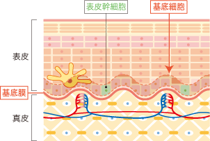肌は「表皮」と「真皮」というふたつの層でできていますが、その境界部分にあるのが基底膜。たった0.1マイクロメートルほどの薄い膜にもかかわらず、肌にとって欠かせないたくさんの役割を担っています。