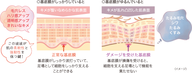 健康な基底膜は表皮をしっかり支え、キメが整い、毛穴も目立ちにくいなめらかな肌印象に。一方、ダメージを受けた基底膜は表皮の支えが弱まり、毛穴が下に落ち込んでいるように見えたり、ハリ不足やくすみ、シワなどがあらわれやすくなります。